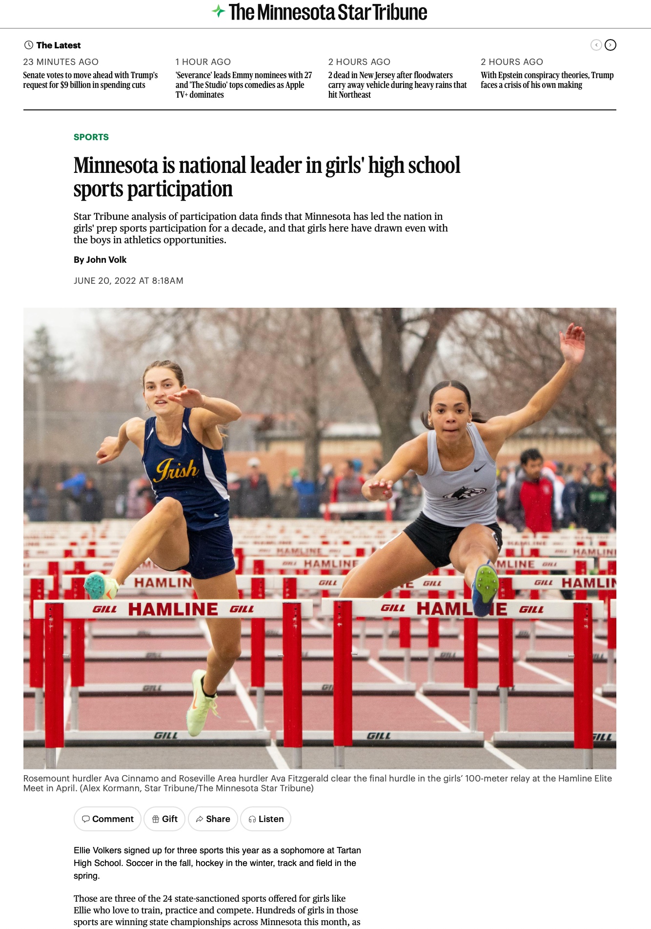 The Minnesota Tribuna analyzed sports data from the Federation of State High School Associations to find the state leads the country in girls’ high school participation. For every 100 Minnesota high school girls, there are 82 athletes.